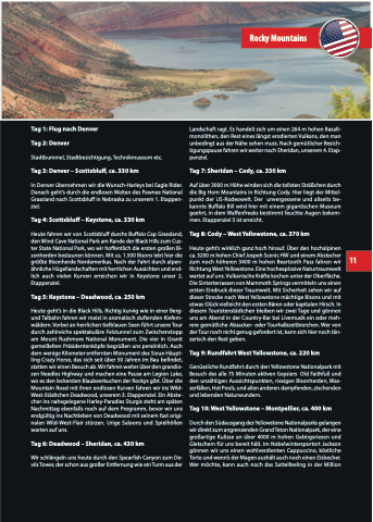 Heute geht’s in die Black Hills. Richtig kurvig wie in einer Berg- und Talbahn fahren wir meist in aromatisch duftenden Kiefern- wäldern. Vorbei an herrlichen tiefblauen Seen führt unsere Tour durch zahlreiche spektakuläre Felstunnel zum Zwischenstopp am Mount Rushmore National Monument. Die vier in Granit gemeißelten Präsidentenköpfe begrüßen uns persönlich. Auch dem wenige Kilometer entfernten Monument des Sioux-Häupt- ling Crazy Horse, das sich seit über 50 Jahren im Bau befindet, statten wir einen Besuch ab. Wir fahren weiter über den grandio- sen Needles Highway und machen eine Pause am Legion Lake, wo es den leckersten Blaubeerkuchen der Rockys gibt. Über die Mountain Road mit ihren endlosen Kurven fahren wir ins Wild- West-Städtchen Deadwood, unserem 3. Etappenziel. Ein Abste- cher ins nahegelegene Harley-Paradies Sturgis steht am späten Nachmittag ebenfalls noch auf dem Programm, bevor wir uns endgültig ins Nachtleben von Deadwood mit seinem fast origi- nalen Wild-West-Flair stürzen. Urige Saloons und Spielhöllen warten auf uns.